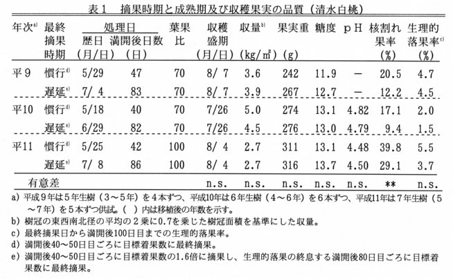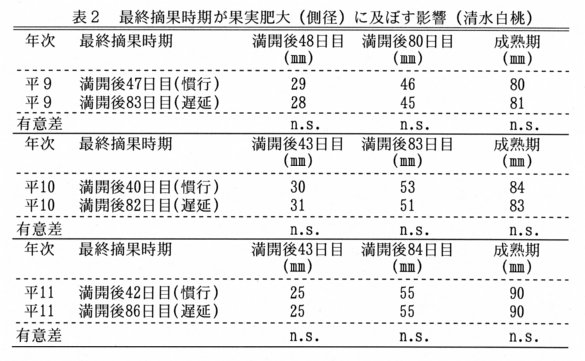 関連情報等:モモ‘清水白桃’の果実肥大に及ぼす最終摘果時期の影響、園芸学会中四国支部、第39号、11、2000.