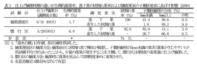 - 仕上げ摘果時期を慣行の満開後50日頃から子葉胚の縦径が5mm以上に発育した時期以降に遅らせることで、落果が軽減できる(表1)。
