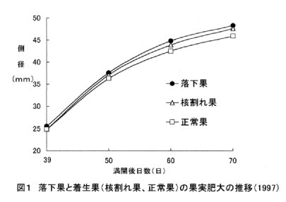 - 6月下旬から7月上旬の生理落果は、満開後40~60日頃にかけて側径が旺盛に肥大し、子葉胚が5mm未満で発育を停止した核割れ果に多い(図1、表1)。