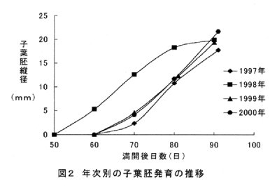 - 子葉胚の発育時期は年により異なる。特に、開花後が高温で推移した年には胚の発育は早まる(図2)。そのため、満開後60日頃から定期的に果実を採取して胚の発育状況を調べ、摘果時期を決める。