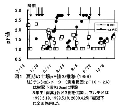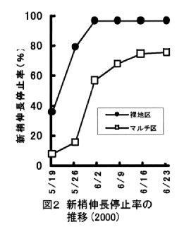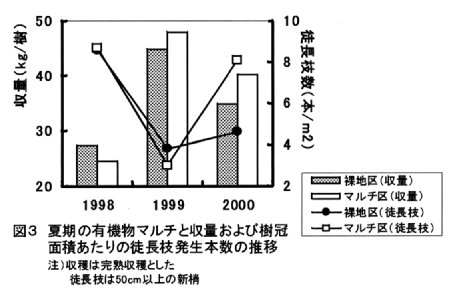 - 土壌が乾燥する夏期に樹冠下の地表面を有機物でマルチする栽培法は、土壌乾燥を抑制し、樹勢を良好に維持でき、収量も多くなる。