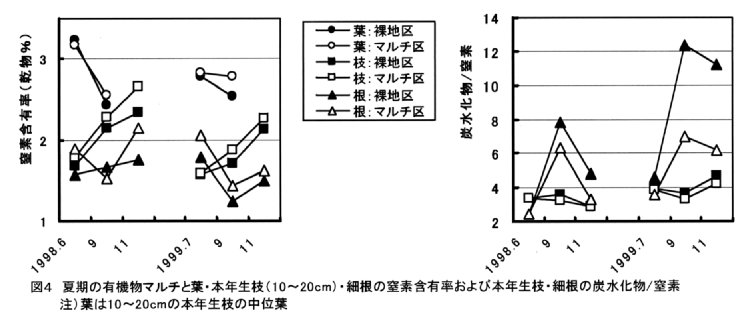 - 有機物マルチ栽培は裸地栽培より葉・本年生枝・細根の窒素含有率が高く、本年生枝・細根の炭水化物/窒素が低くなり、樹体栄養が良好になる(図4)。