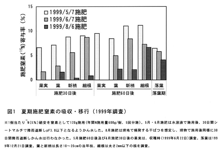 - 5月7日施肥は、いずれの器官においても施肥窒素寄与率(全窒素に占める施肥窒素の割合)が葉の8.5%~細根の11.1%と6月7日、8月6日施肥より高く、樹体への吸収に優れる。また、収穫時(1999年6月22日)の果実の施肥窒素寄与率も施肥60日後で9.5%と高い。8月6日施肥では、施肥30日後で最も高い葉においても1.6%と低く、シートマルチ除去後の施肥60日後でも細根の6.6%以下と低く、吸収が劣る(図1)。