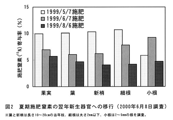 - 5月施肥は、翌年発生する新生器官(果実・葉・新梢・細根)の施肥窒素寄与率が約10%と6月・8月施肥より高く、移行に優れる(図2)。