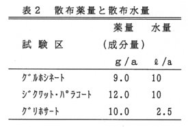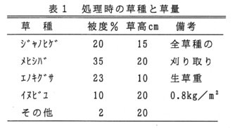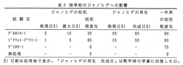 - ジクワット・パラコ-ト液剤ではジャノヒゲの枯れ込みは他の2剤より大きいが、再生の開始が早く(表3)、処理時の草量にまで回復する間の土壌の流亡はみられない。