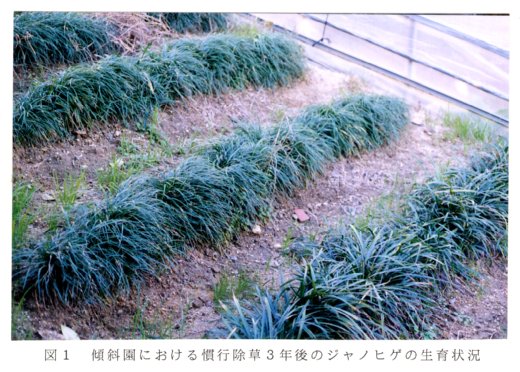 - ジャノヒゲを階段状足場の肩部分に裁植したほ場(斜度20度、黄色埴壌土)において、春期はグルホシネート液剤、夏期はグリホサートイソプロピルアミン塩液剤による慣行除草を行うと、3年後の生育は被度が植え付け時より増加し、足場の崩壊もない(図1)。