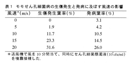 - 送風機でモモ樹に風を当て、同時にせん孔細菌懸濁液を噴霧接種すると、発病葉率は風速が高まるとともに増加する。また、風による生傷発生葉率と発病葉率との間には有意な相関(r=0.9721, P<0.01)が認められる(表1)。