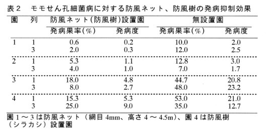 - モモせん孔細菌病の発病は、強風雨(風速10m以上)で生じる傷によって助長される。防風ネット(網目4mm、高さ4m)または防風樹を設置することにより、園内の相対風速は防風ネット、防風樹からの距離とともに減少し、発病抑制効果も風当たりの強い園周辺部(1~3列目)で高ことから、風当たりの強い園地では特に有効である。