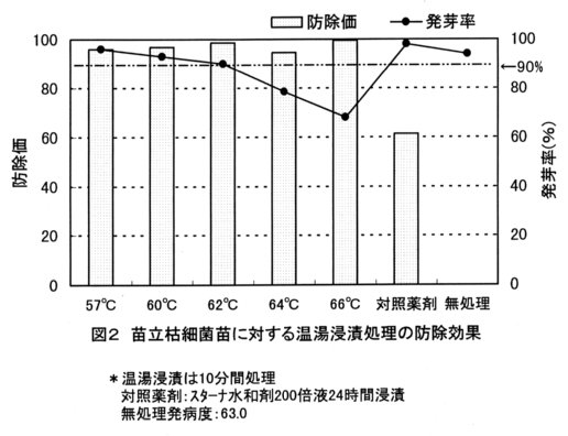 - 苗立枯細菌病の発生抑制に対する実用的な処理法としては、57℃・10分間、60℃・10分間、および62℃・10分間の各処理が有効である(図2)。
