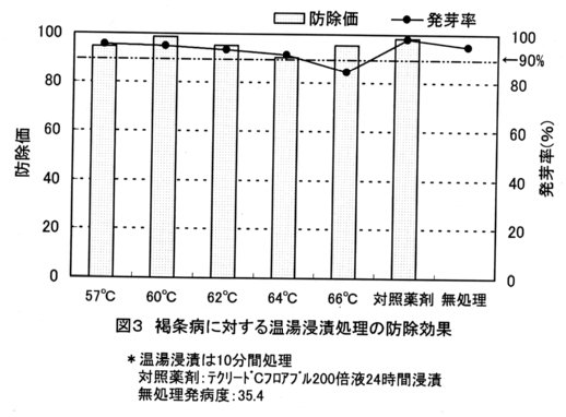 - 褐条病の発生抑制に対する実用的な処理法としては、57℃・10分間、60℃・10分間、62℃・10分間、および64℃・10分間の各処理が有効である(図3)。