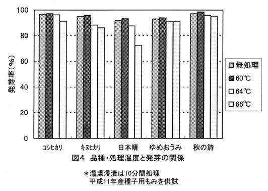 - もみの品質(品種、保存期間、充実程度)は、処理温度が高くなると発芽率が低下しやすい要因のひとつである(図4)。