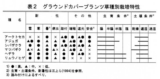 - 中多雪平坦地域でのGCP植栽適草種はアジュガである(表2)。