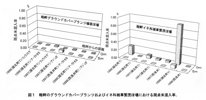 発表論文等:1.畦にグランドカバープランツを植えると斑点米が減る,現代農業,平12(3),180-185,2000.