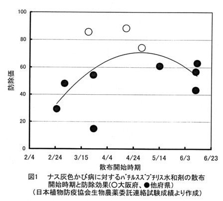 - ナス灰色かび病に対するバチルス ズブチリス水和剤の効果的な使用時期は、有効成分B.subtilis の生育適温域(10~50℃)、散布開始時期と防除効果の関係(図1)から判断して、ナス施設栽培では防除価50以上が期待できる3月中旬以降である。