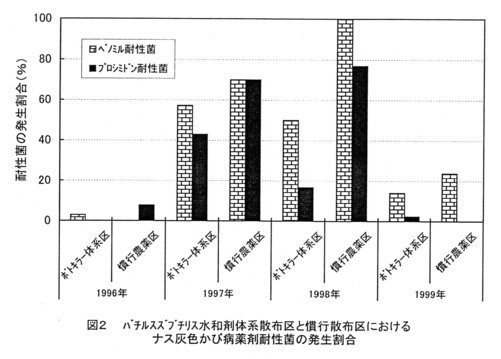 - 微生物農薬体系散布区の薬剤毎の耐性菌率の発生比率は、慣行散布区と比較してその発生に抑制効果が認められる(図2)。