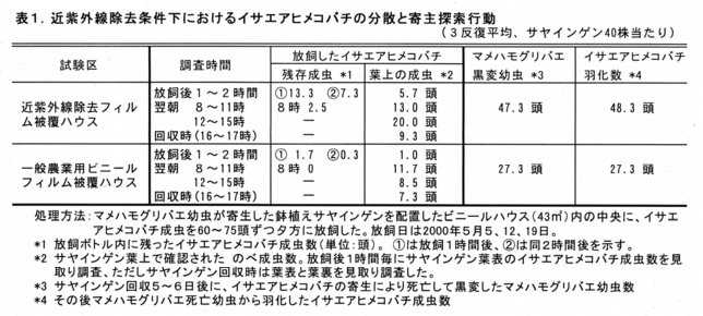 - 近紫外線除去条件下ではヒメコバチの分散は抑制されるが、マメハモグリバエに対する寄主探索行動および寄生が認められる(表1)。