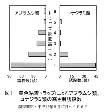 - アブラムシ類、コナジラミ類は、黄色粘着トラップによると、地上1m程度の低い位置を飛翔すると推察される(図1)。