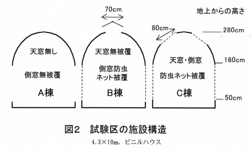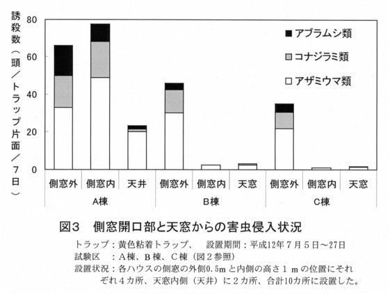 - 天窓無し・側窓無被覆(以下、A棟)、天窓無被覆・側窓防虫ネット被覆(以下、B棟)、天窓・側窓ともに防虫ネット被覆(以下、C棟)の3ハウス(図2)を設定すると、アブラムシ類、コナジラミ類、アザミウマ類は、主に側窓開口部からハウス内へ侵入し、天窓換気部からの侵入は極めて少ない(図3)。