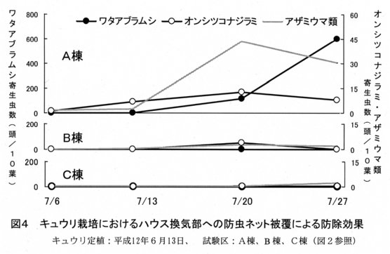 - これら害虫のキュウリにおける発生密度は、A棟に比べ、B棟とC棟では極めて低く推移し、側窓の防虫ネット被覆による侵入防止効果が高い(図4)。
