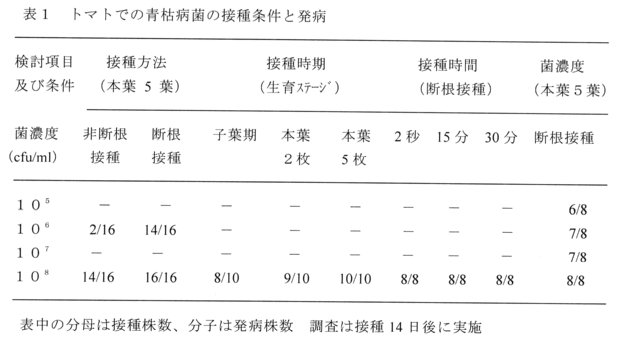 - 青枯病に感受性の高いトマトを供試して確実に感染・発病する接種条件を検討したところ、本葉5葉期のトマトを108 cfu /ml レベルの青枯病菌懸濁液中で断根接種(数秒間の浸漬)し、接種後28℃、16時間照明下の人工気象室で栽培することにより、接種14日以内で100%の感染・発病株率を認めることができた(表1)。