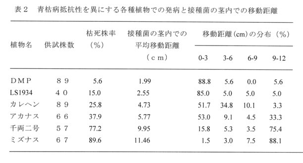 - 上記の接種条件を抵抗性を異にする各種ナス属植物に適用し、発病(枯死株率)と接種菌の茎内の移動距離を調査したところ、枯死株率と青枯病菌の茎内の移動との間に高い相関関係が認められ、各植物の抵抗性を予想することが可能と考えられた(表2)。なお、本法における病徴は土耕栽培の場合とは異なり、下葉から上葉に向かう落葉が主な病徴であった。