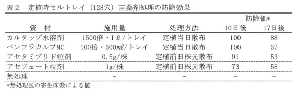 - 定植時の薬剤処理の効果:カルタップ水溶剤の定植直前散布の効果は高く、半月程度の持続効果が認められる。定植直前のベンフラカルブMCの散布及びアセタミプリド粒剤の株元散布も高い防除効果が認められるが、残効が劣る(表2)。