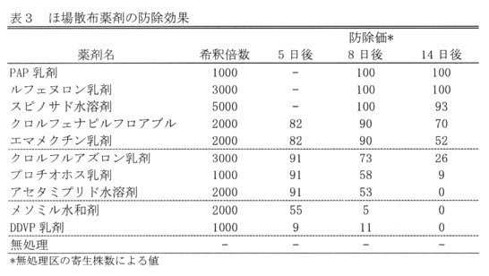 - 定植後の薬剤散布効果:PAP乳剤、ルフェヌロン乳剤、スピノサド水溶剤には約2週間の優れた防除効果が認められる。クロルフェナピルフロアブル、エマメクチン乳剤の効果は8日間程度でやや劣る(表3)。