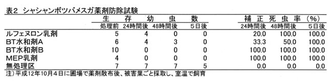 - シャシャンボツバメスガ幼虫に対するルフェヌロン乳剤、BT剤、MEP乳剤の防除効果は高い(表2)。