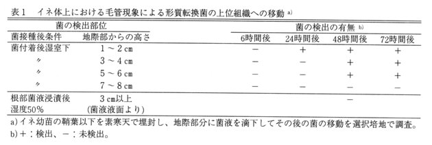 - イネの地際部に付着させたイネ内穎褐変病菌は、イネ体上における毛管現象により上位組織に移行する(表1)。