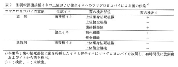 - 保菌組織に接触したツマグロヨコバイは、イネの上位組織および他の健全イネに病原菌を媒介する(表2)。