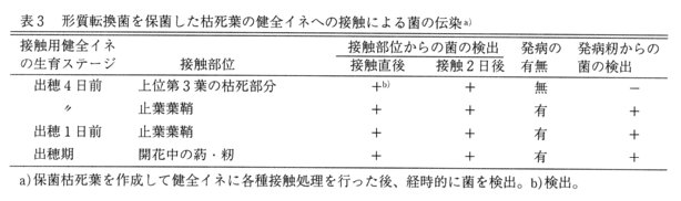 - イネの保菌枯死葉と健全イネとの接触によって病原菌は健全イネに移行する。また、止葉葉鞘および出穂期の穂への保菌枯死葉の接触は、発病の一因となる(表3)。