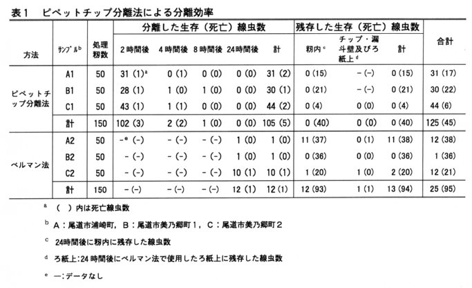 - 鋏で縦に2分した籾50粒を用いて比較したところ、ベルマン法では、25℃の定温条件24時間で全線虫の10.8%しか分離できず、籾内で死亡した個体が多かったが(表1、図2)、ピペットチップ分離法では、2時間で全線虫数の70.0%、4時間で72.7%が分離でき、チップ及び壁面に残存しない(表1、図2)。
