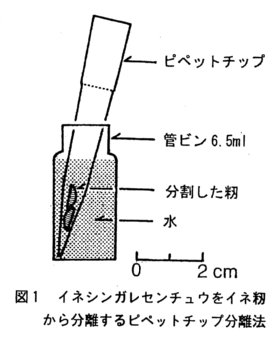 - 水稲籾を鋏で縦に二分し、プラスチックピペットチップに入れ、管ビン内の水に浸漬するピペットチップ分離法では、ベルマン法に比べて、短時間で高い分離効率でイネシンガレセンチュウを分離できる。