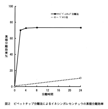 - 以上のように、ベルマン法よりもピペットチップ分離法の方が分離時間が短縮でき、線虫の分離効率は高く、個体数調査に適している。