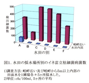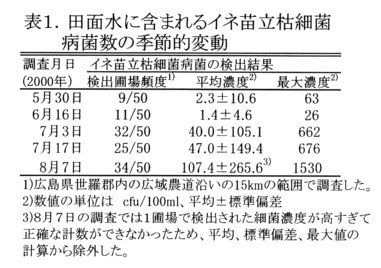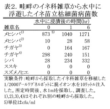 - 上記水田の畦畔から採取したイネ科雑草をワグネルポットに移植し、脱イオン水を注入すると、イネ苗立枯細菌病菌が水中に浮遊する。その濃度は田面水の約100倍程度である(表2)。畦畔沿いの田面水の方が細菌濃度が高いのは、畦畔雑草由来と考えられる。