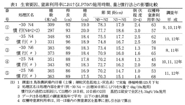 - 穂数はLP70を追肥することで、慣行より増加する傾向にある。また、LP70を早期に追肥(出穂35日前)すると下位節間長(N3~N5)が伸長する傾向にあるが、倒伏は慣行と同程度であり栽培上支障はない(表1)。