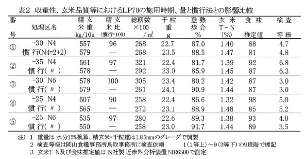 - 玄米中窒素濃度はLP70追肥区が軒並み慣行より低くなり、食味推定値は慣行と同等かそれより高くなる傾向にある。検査等級には顕著な差は認められない(表2)。