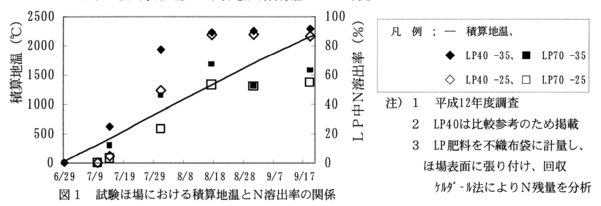 - LP70を追肥した後の窒素溶出パターンは、8月中旬までは積算地温とほぼリニアに推移するが、間断かんがいを続ける8月下旬以降は停滞する傾向にある(図1)。