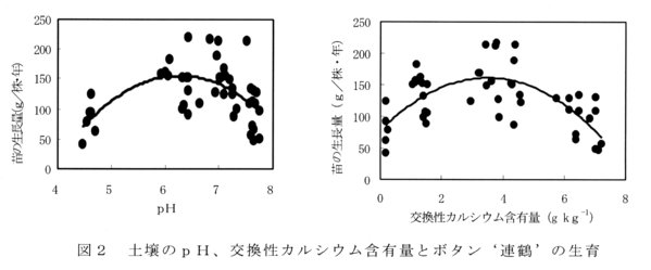 - ボタン苗木栽培土壌(黒ボク土)の好適値は概ね、pHが6~7であり交換性カルシウム含有量が3~4g kg -1 である(図2)。