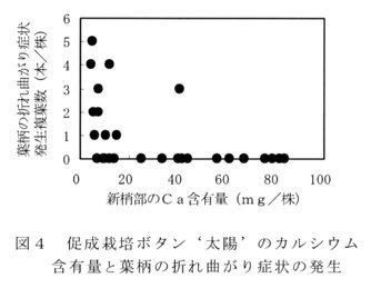- 育苗時の石灰質肥料の施用により、促成栽培ボタンの新梢部のカルシウム含有量は増加する(図3)。また、新梢部のカルシウム含有量が多いと葉柄の折れ曲がり症状の発生は抑制される傾向にある(図4)。