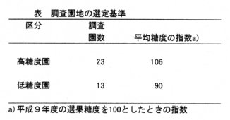 - 本県南部地域の非破壊糖度光センサーを導入したモモ産地では、各園地の糖度データから、安定した高糖度園がある一方、恒常的な低糖度園も認められる。そこで、産地の標準的な栽培管理を行い,平均的着果量のモモ園のうち、高糖度園23園、低糖度園13園を選定して土壌調査を行い、糖度の高いモモ園と糖度の低いモモ園の土壌理化学的特徴を明らかにする。調査園の土壌は、粘質土壌が細粒黄色土,砂質土壌が中粗粒黄色土である。