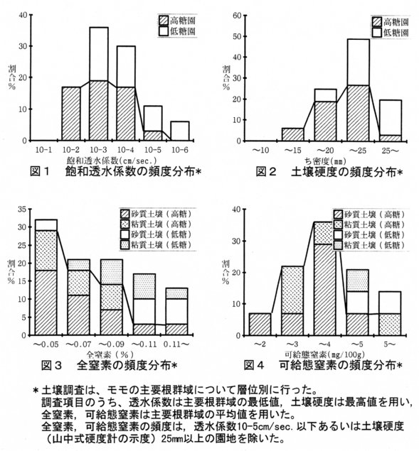 - 糖度の高いモモ(清水白桃)園は、土壌の透水係数が高く、土壌硬度が低い。また、土壌の全窒素、可給態窒素含有量が必要以上に多くなると、糖度の低いモモ園の割合が増加する。