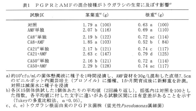 - トウガラシに対して生育促進効果を示すPGPRとAMF(Gigaspora margarita ;セラキンコン、以下すべて同種)を播種時に混合接種すると、AMFとPGPR菌株との組み合わせによって、PGPR単独接種の場合と比べてトウガラシに対する生育促進効果が増強する場合、減少する場合および変化がない場合がある(表1)。