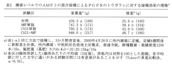 - 生育促進効果が増強される組み合わせのPGPR菌株(Pseudomonas putida CA21株)とAMFの混合接種区(以下の混合接種区はすべてこの組み合わせ)おいては、圃場レベルでも生育促進効果の増強現象は持続される(表2)。