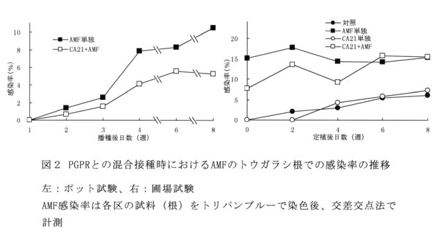 - 混合接種区におけるAMFの感染率は、ポットレベルではAMF単独接種区より低く推移するが、圃場定植後は混合接種区の感染率が上昇し、定植後6週間目以降は混合接種区とAMF単独接種区は同程度の感染率で推移する(図2)。