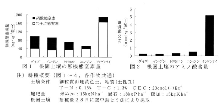 - チンゲンサイの根圏土壌は無機態窒素、水抽出タンパク質、アミノ酸含量が多く、またプロテアーゼ活性も高いことから、根圏においてタンパク質を分解して吸収している可能性が高い。