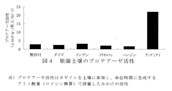 - チンゲンサイ根圏土壌のプロテアーゼ活性は、他の作物に比べて明らかに高い(図4)。