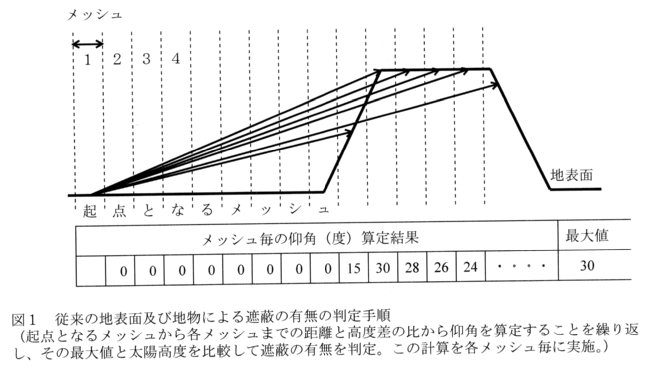 - 従来の計算手順では、図1に示されるように、あるメッシュから光源方向に向う各メッシュまでの距離と高度差の比から仰角を計算することを繰り返して、光源方向の仰角の最大値を算定する。そして、その値と太陽高度を比較して、光源方向の遮蔽物の有無を判定する。