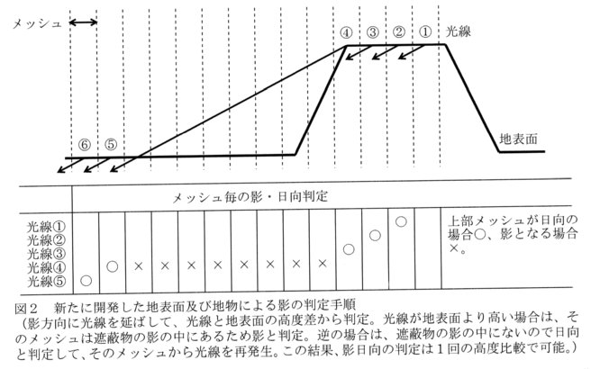 - 新しい計算手順では、図2に示されるように、光線をメッシュから影方向に延ばして、地表面や地物と高度を比較して、そのメッシュが遮蔽物の影の中にあるかないかを判定する。