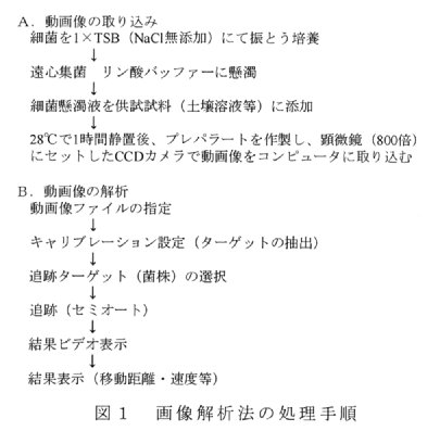 - 画像解析装置を利用した方法は、軟寒天法のように土壌溶液に熱を加えることなく利用できるため、土壌溶液の熱による変性等もなく、しかも少量の試料で、土壌中で実際に細菌が生息している条件で細菌の運動性を解析できる。